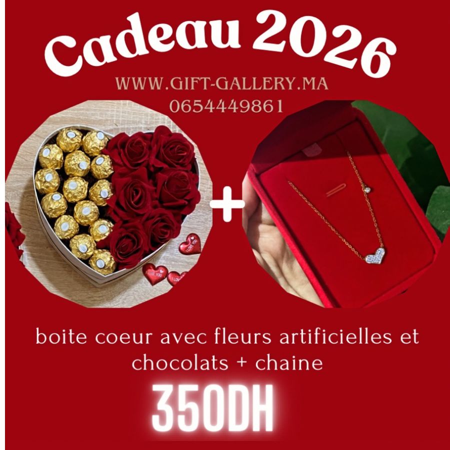 BOITE COEURS TAILLE M AVEC FLEURS ARTIFICIELLE ET CHOCOLATS + BIJOU د.م. 299,00